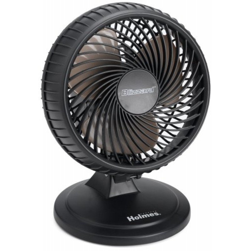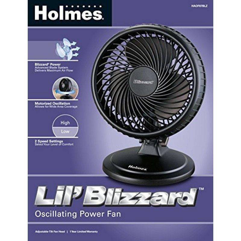 Create a blizzard of coolness with the specially-designed motor and blade combination of the Holmes Lil' Blizzard Performance Table Fan that propels powerful airflow and generates cooling comfort. It features two speed-settings and an adjustable tilt-head for directing airflow more precisely to provide maximum effectiveness. Oscillation disperses cool air out to cover a wide area in small rooms. Because it operates in a quiet-mode, it's ideal for tabletop use in any room.