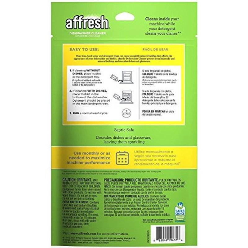 The new affresh dishwasher and disposal cleaner is the powerful, ground-breaking solution for unwanted dishwasher and disposal odor. These innovative tablets help prevent odor in the dishwasher and disposal. Developed with the consumer in mind, these cleaner tablets help remove even the most stubborn odors from dishwashers and disposals. Use once a month or as needed for a cleaner fresher dishwasher and disposer. Affresh cleaner keeps the dishwasher and disposal fresh for up to a month by penetrating, dissolving and removing odor. It's a fast and simple way to keep the inside of these appliances clean and smelling fresh. Pouch contains 6 tablets.