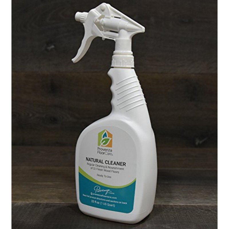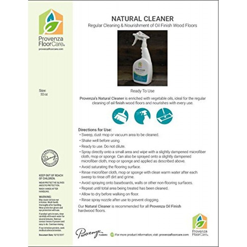 Provenza?s Natural Cleaner is enriched with vegetable oils, ideal for the regular cleaning of oil finish wood floors. (32 oz Spray) Directions for Use: ? Sweep, dust mop or vacuum area to be cleaned. ? Shake well before using. ? Ready to use. Do not dilute. ? Spray directly onto a small area and wipe with a slightly dampened microfiber cloth, mop or sponge. Can also be sprayed onto a slightly dampened microfiber cloth, mop or sponge and applied as described above. ? Avoid saturating the flooring surface. ? Rinse microfiber cloth, mop or sponge with clean warm water after each sweep to rinse off dirt and grime. ? Avoid spraying onto baseboards, walls or other non-flooring surfaces. ? Repeat until total area being treated has been cleaned. ? Allow to dry before walking on floor. ? Rinse spray nozzle after use to prevent clogging. Our Natural Cleaner is recommended for all Provenza Oil Finish hardwood floors.