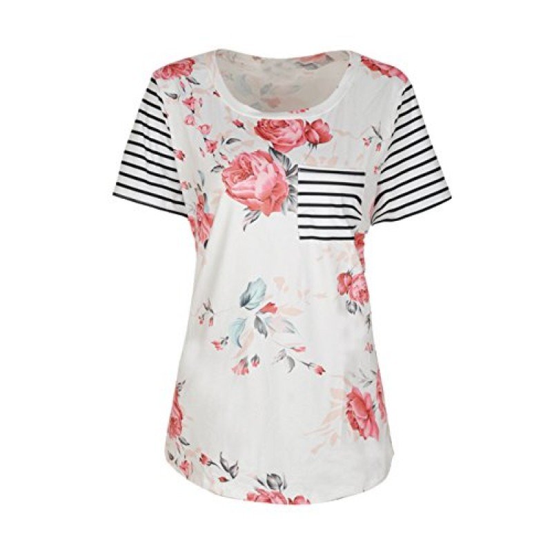 HIKARE Women's Summer Floral Print Striped Short Sleeve Casual T-Shirt Tops With Pocket