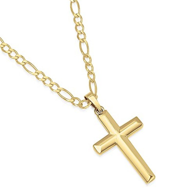 14K gold plated solid sterling silver cross pendant on a choice of matching gold plated solid sterling silver figaro chain necklaces. These chains are 3.0mm or 4.0mm wide, of the finest quality and imported from Italy. Comes in a Free Gift Box and with our refund guarantee.